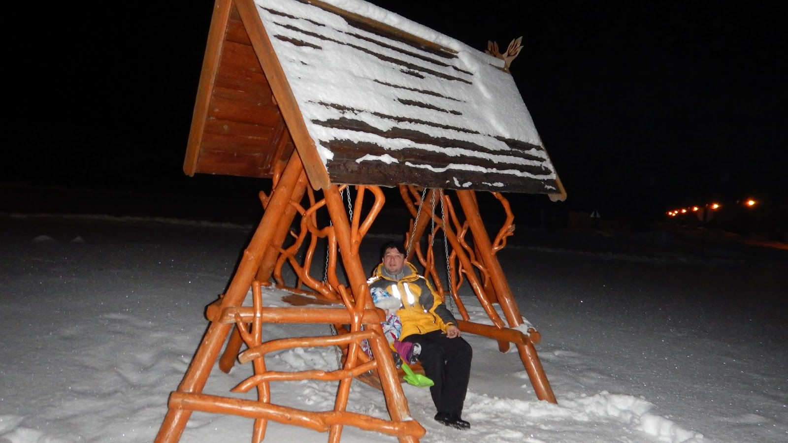 Особенности приготовления шашлыка в зимний период описывать не буду, ибо дело это мужское. Может быть муж с сыном когда-нибудь захотят описать свои ощущения и ноу-хау. Я же могу только вспомнить теплый семейный ужин нашего первого вечера на Свияге. После ужина решили прогуляться немного. Разведали горку, детскую площадку, на которой стояла большая украшенная елка. Площадка была одобрена и старшим, и младшими, и даже взрослыми.